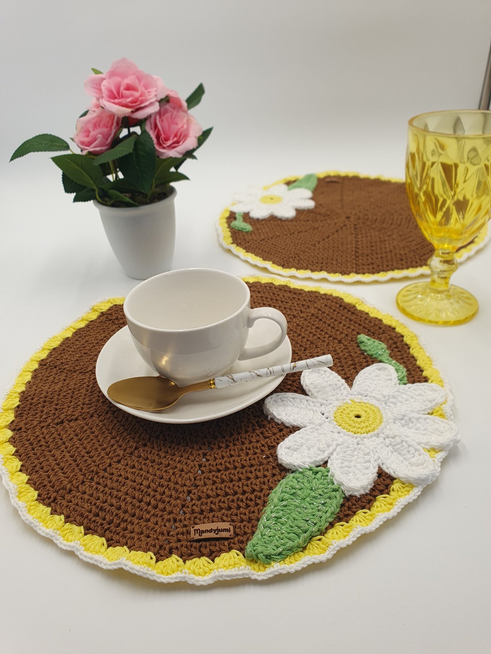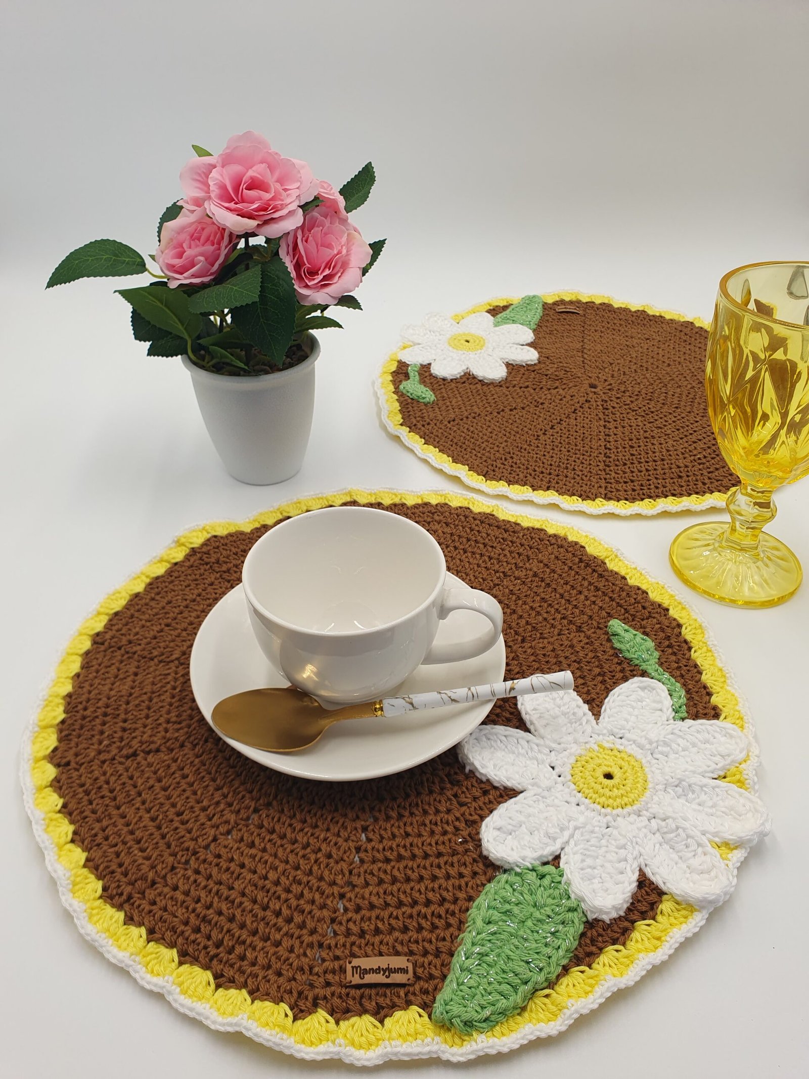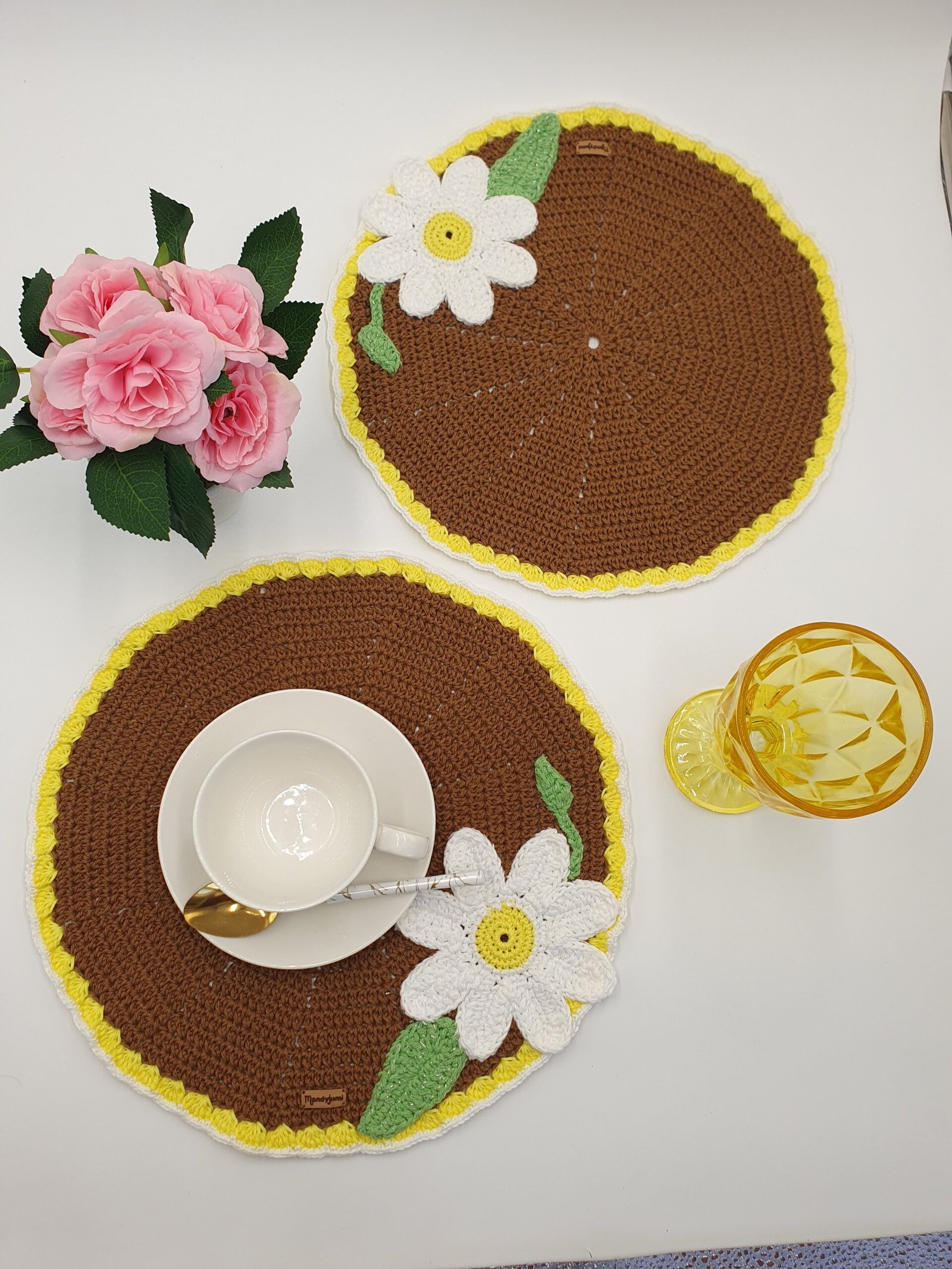 - Diseño encantador: Con un diámetro de 35 cm, estos individuales presentan un cálido color marrón como base, realzado por un vibrante borde amarillo y blanco. La aplicación de una delicada flor tipo margarita en crochet en tonos blanco, amarillo y verde, añade un toque de naturaleza y alegría a tu mesa.