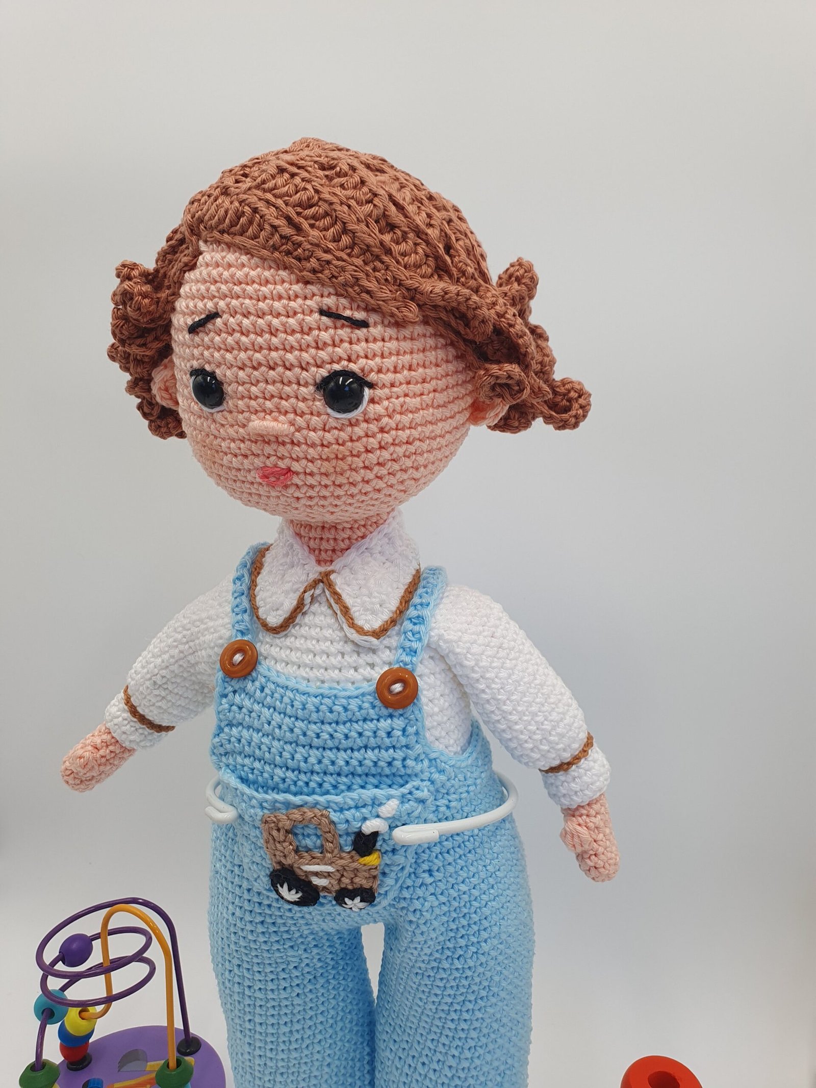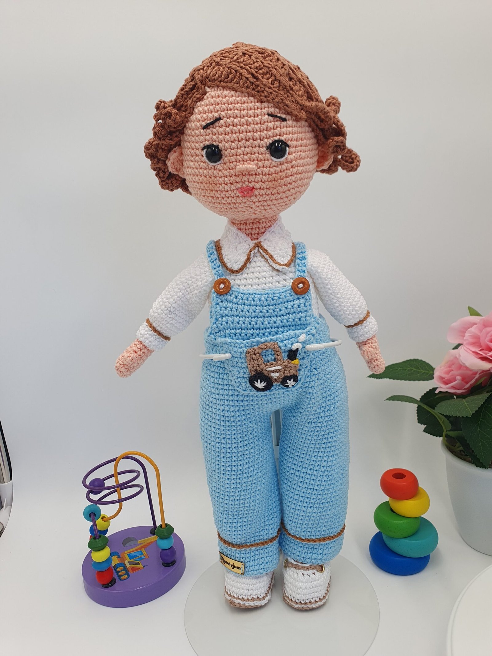 Este adorable muñeco de crochet mide 38 cm de ternura, perfecto para abrazar y acompañar en mil aventuras. Benjamín luce un encantador conjunto de jardinero azul con detalles en color crema y un simpático parche de un tractor. Sus zapatitos de crochet a juego, con un tamaño de 9 cm, completan su adorable atuendo. Cada puntada ha sido cuidadosamente tejida para crear un muñeco único y especial.