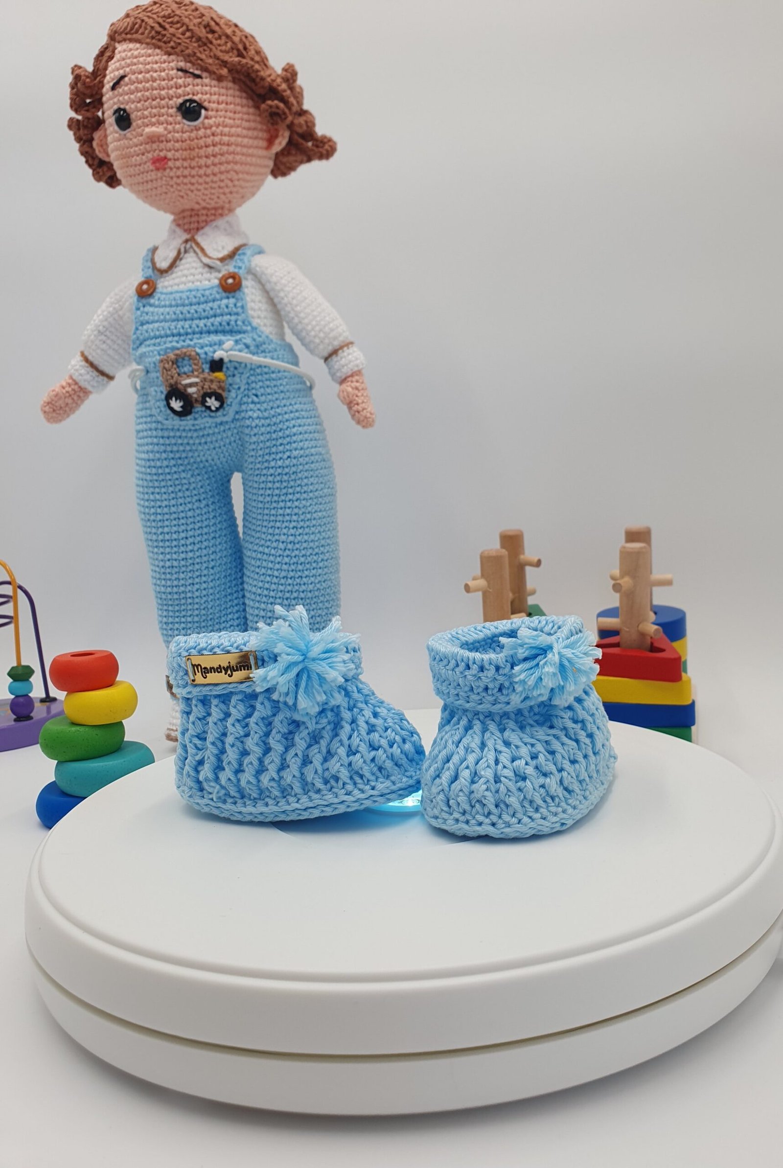 Importante: Los elementos decorativos que aparecen en la fotografía (como los juguetes de madera y el florero con rosas) no se incluyen con la compra del muñeco y los zapatitos, son solo para fines ilustrativos.